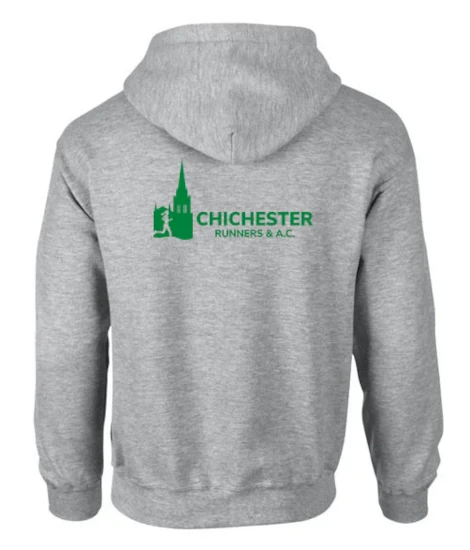 Chichester Runners junior and adult hoodies and adult zoodies (zip-up hoodies) are available from Game, Set and Match on Quarry Lane. These tops are printed to order and have customisation options, so you can get your name, initials, event, specialism, coffee order or anything else printed on the chest and/or sleeve.